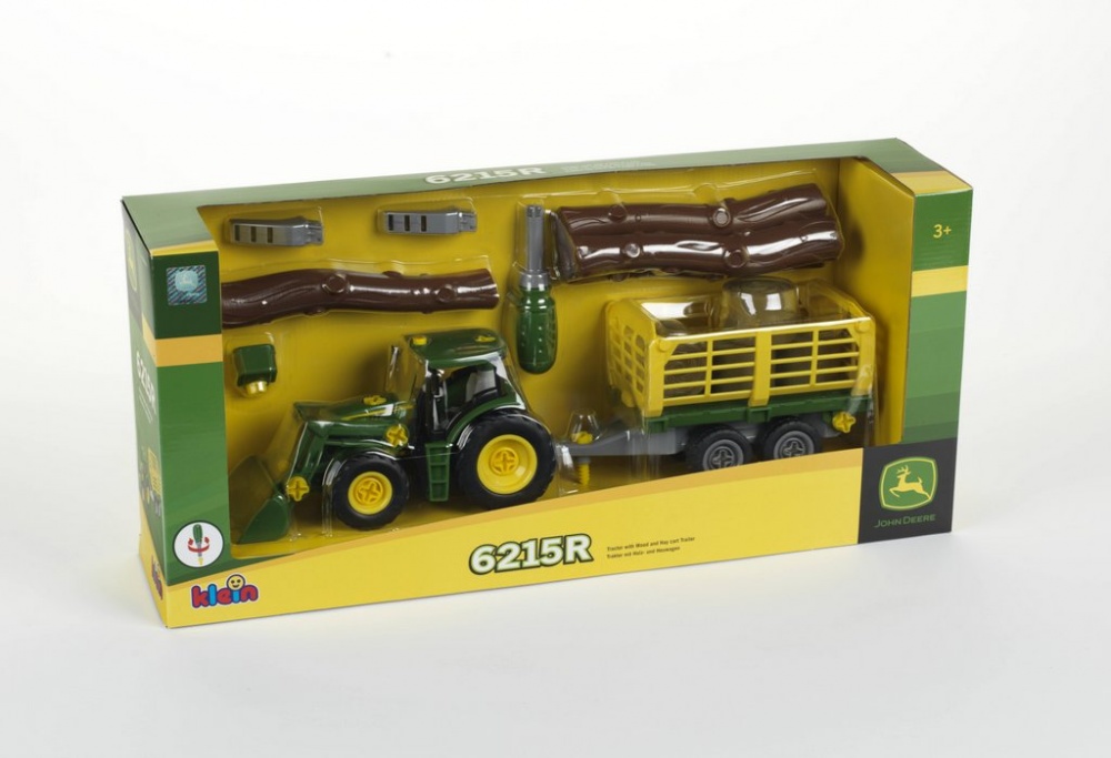 John Deere traktors ar koka un siena piekabi Atklājiet jauno John Deere CONSTRUCTION Line. Izveidojiet savu John Deere 6215 R traktoru 1:24. Paņemiet šasiju, uzstādiet riepas, sēdekli, vadītāja kabīni un motora pārsegu. Vai vēlaties izmantot frontālo iekrāvēju, lai iekrautu siena ķīpas piekabē? Uzstādiet siena stiprinājumus uz piekabes. Vai arī vēlaties pārvadāt malku? Pēc tam pārveidojiet piekabi par koka transportētāju. Neaizmirstiet par atsvaru traktora priekšpusē.